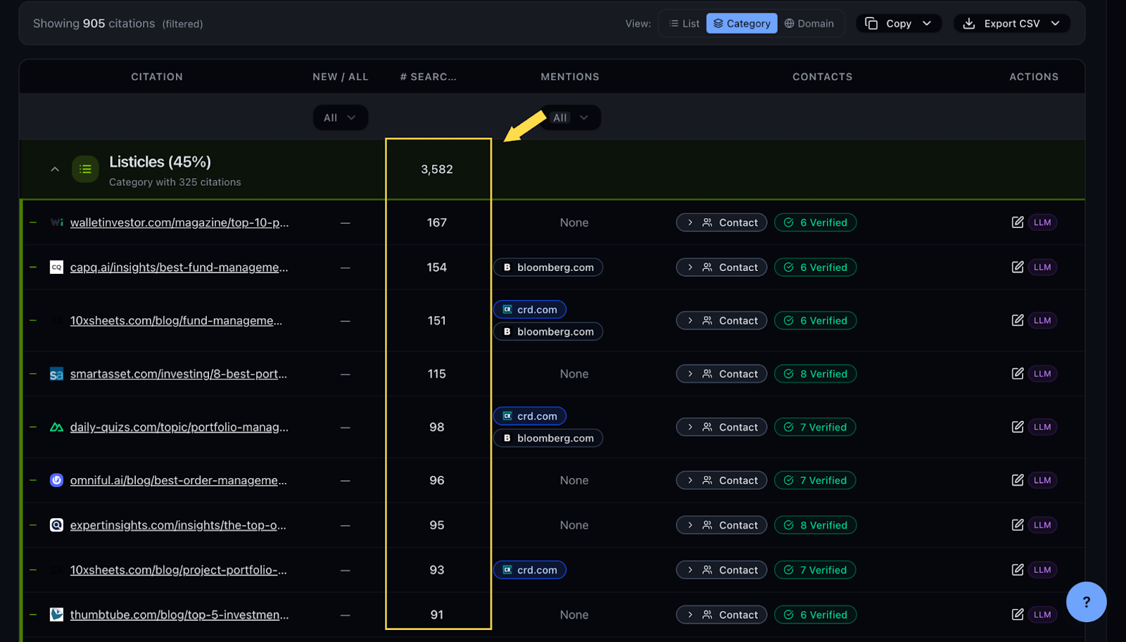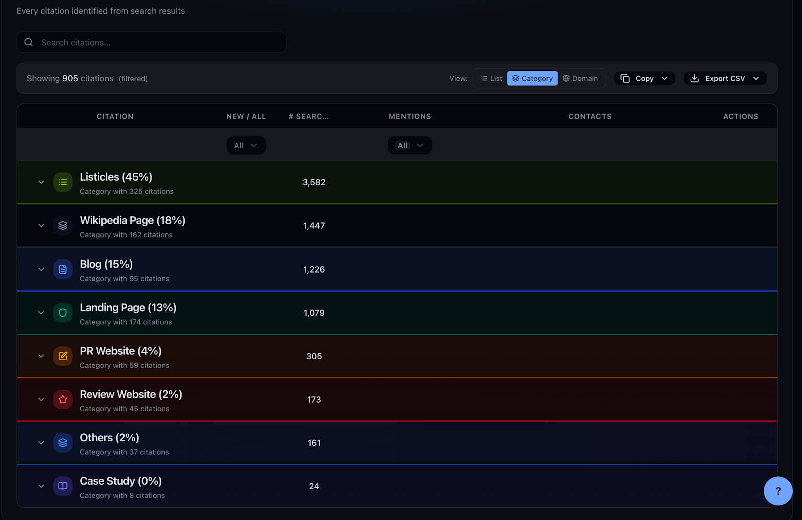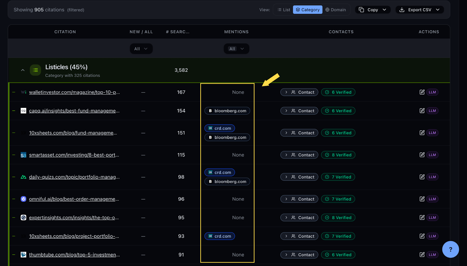 Chosenly automatically categorizes every citation into types (like listicles, blogs, landing pages, review sites, Wikipedia, PR) so you can filter down to outreach-ready pages without opening a single link. Just like the last step, you can literally skip the manual categorization step completely.