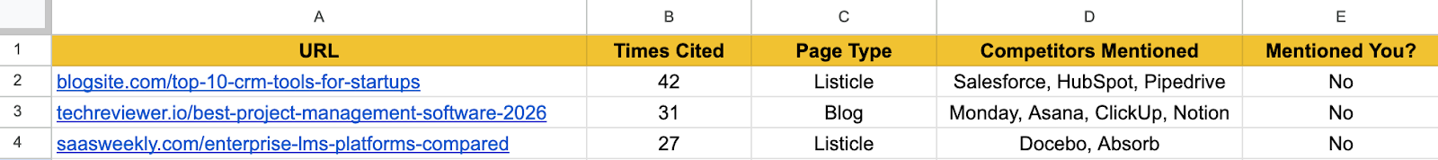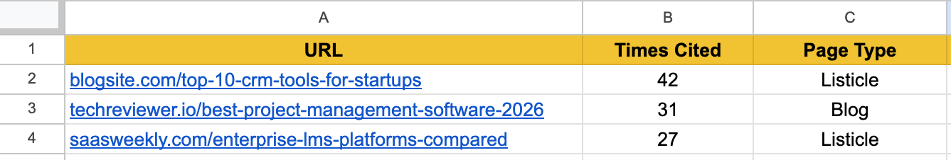 - Important: Once you have all the URLs in one place, create a pivot table so you know how many answers each URL influenced. A page that shows up as a citation across 40 of your searches has a much higher priority than one that appeared once.