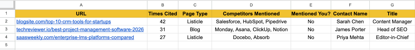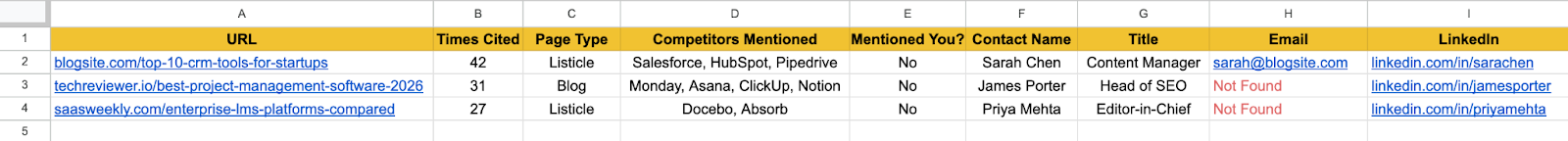 If a page mentions zero competitors (or even just one) and the topic is adjacent but not quite right (say, "Best HR Software" when you sell project management), ignore it. ChatGPT sometimes pulls in irrelevant citations that may seem related, and reaching out to these authors wastes both your time and theirs.