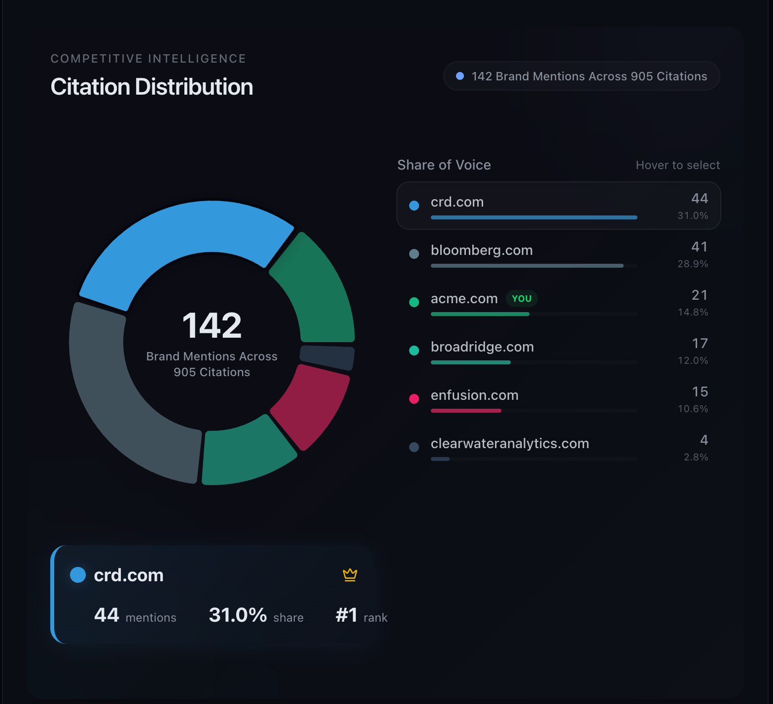 Chosenly's Citation Distribution view showing how 905 citations are split across competitors, with the main brand's share of voice at 14.8%