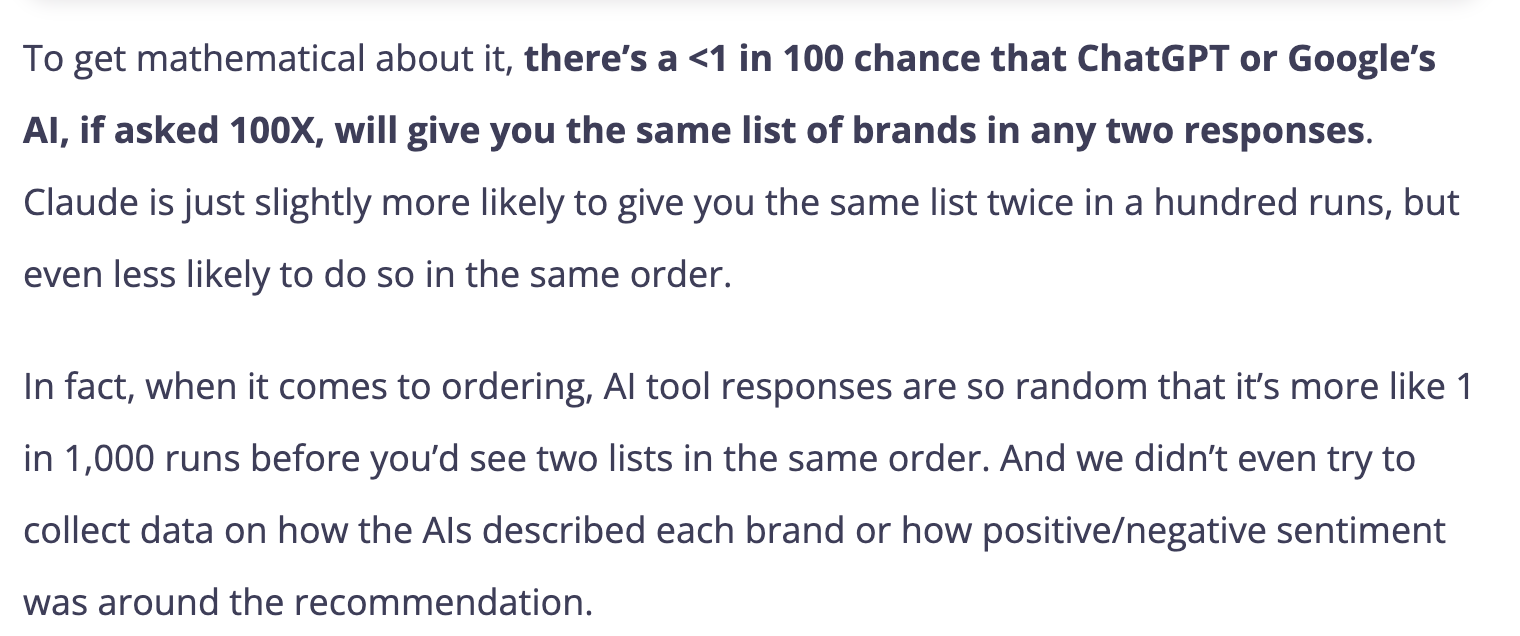 Rand’s first claim is that if you ask an AI the same question multiple times, you will not get the same list of brands every time. Different brands show up, sometimes brands disappear, and sometimes new ones appear.
