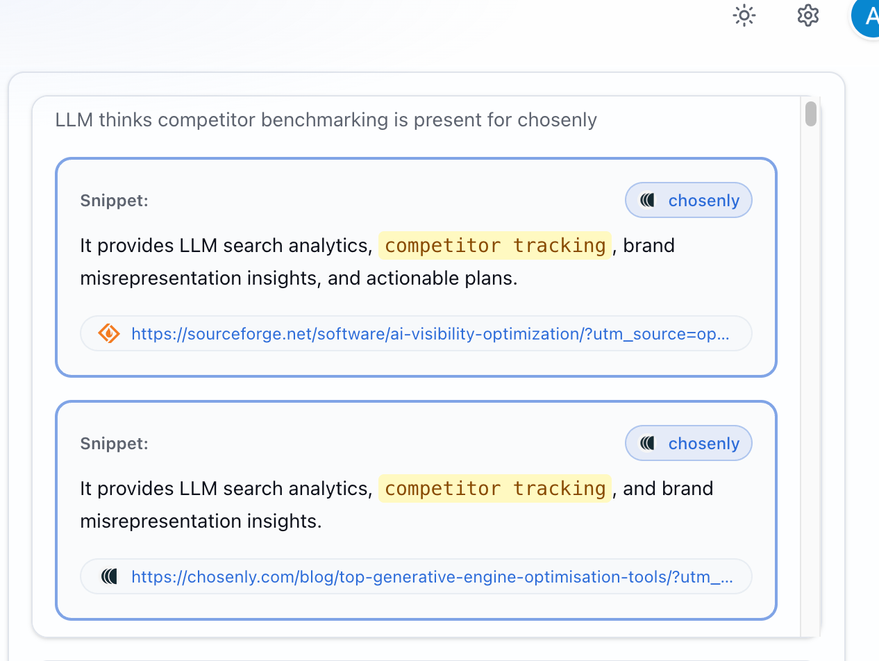 Out of the 100+ things the model could have said about Chosenly, it repeatedly chose to bring up competitor tracking. So we know LLMs probably believe AI search tools should be good at competitor tracking.