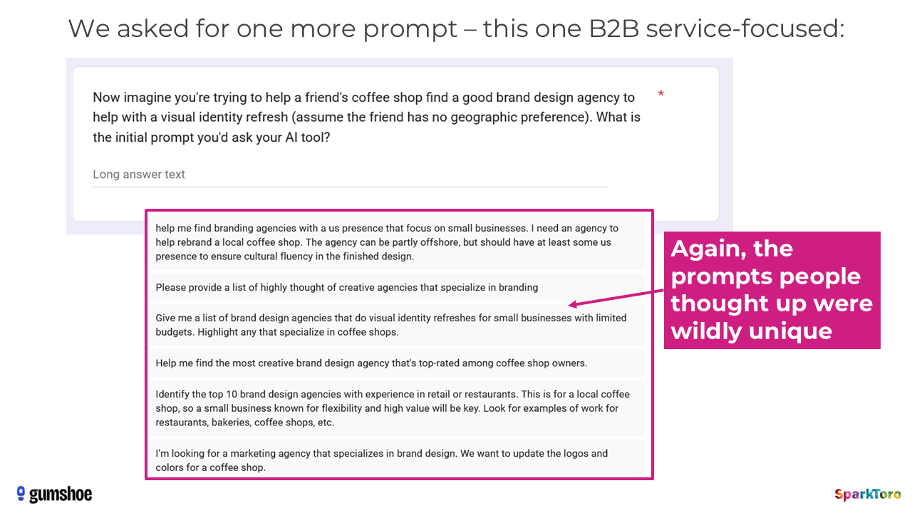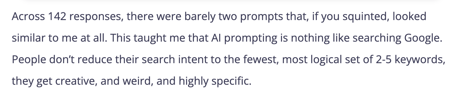 This is a screenshot from the research Rand did. Every single prompt is unique. (Told you, Rand always backs his claims with data)