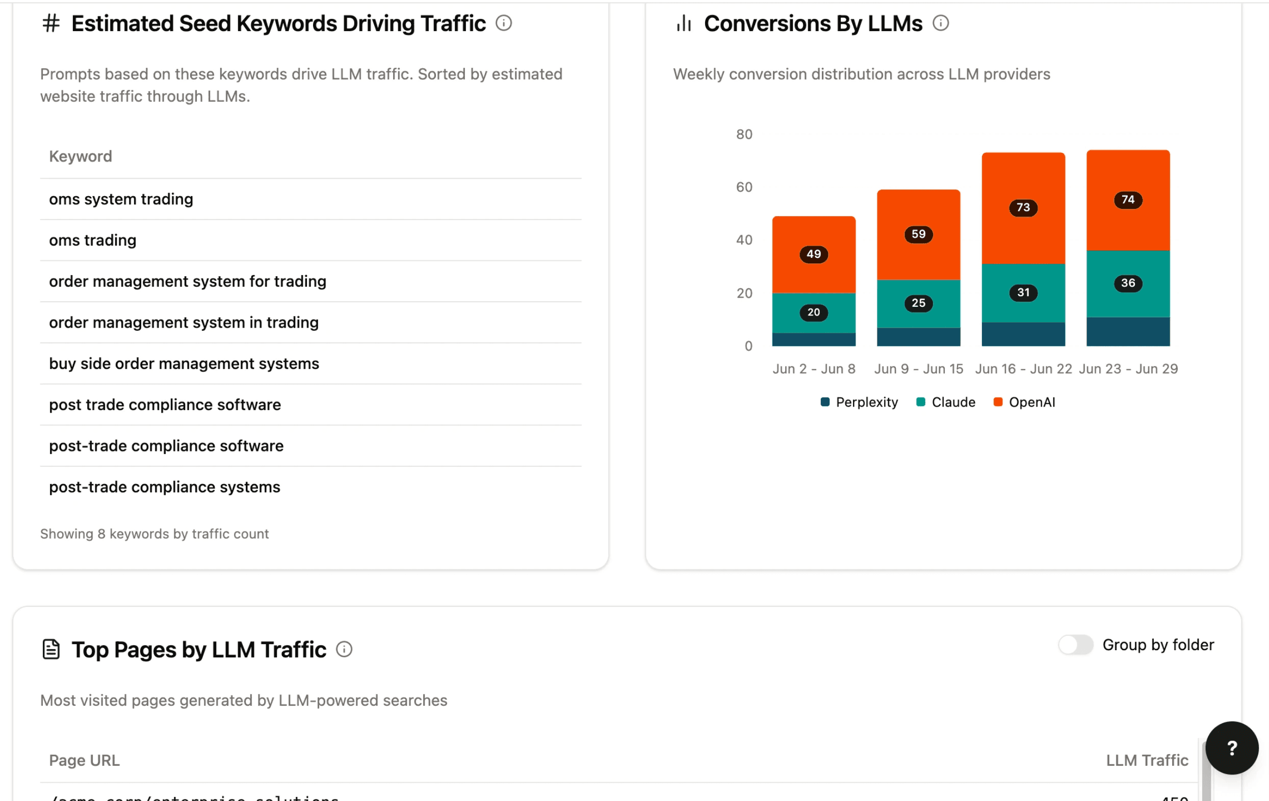 Get a clear, unified view of the traffic, conversions, citations, and LLM distribution your content drives. You can track which pages get referenced, which prompts trigger visibility, and how that visibility turns into pipeline, all in a single dashboard.